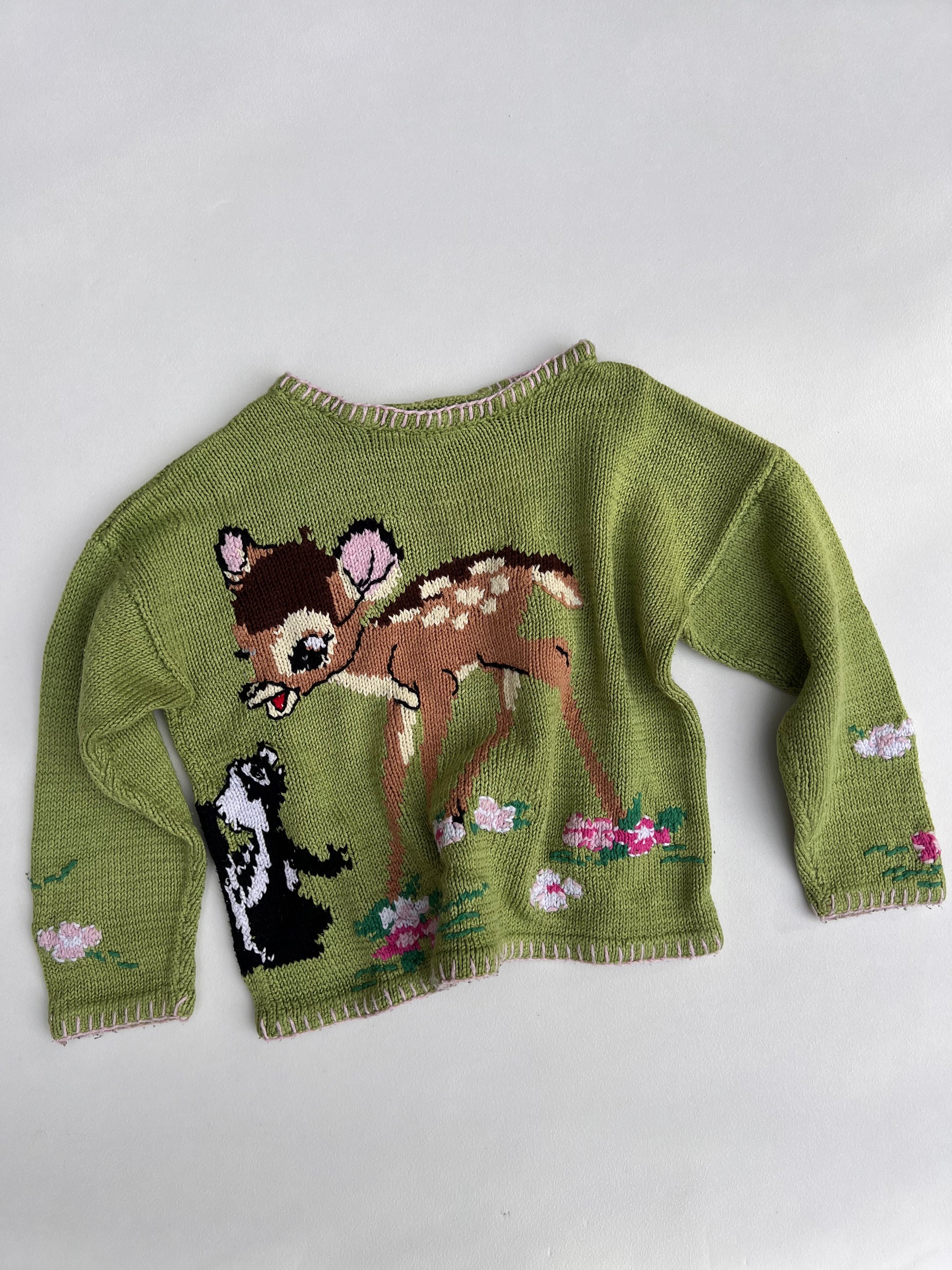 Vintage handmade Bambi sweater with an all-over-print, which is rather impressive considering this has been knitted by hand. It feels like 100& cotton.