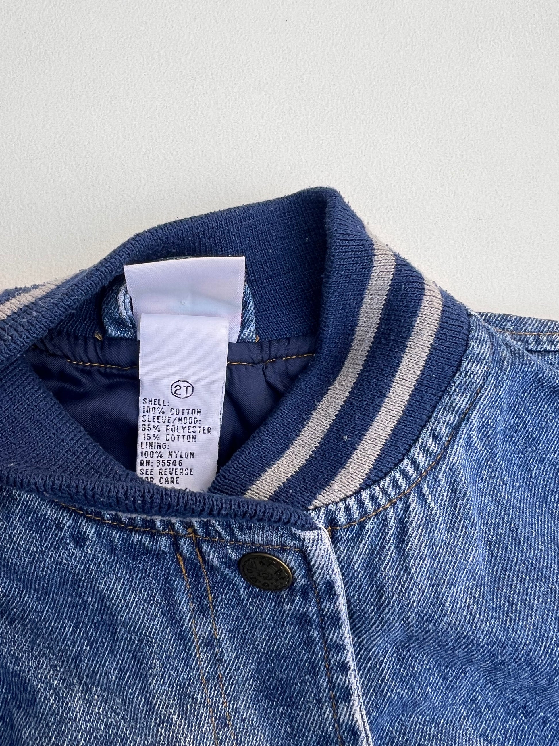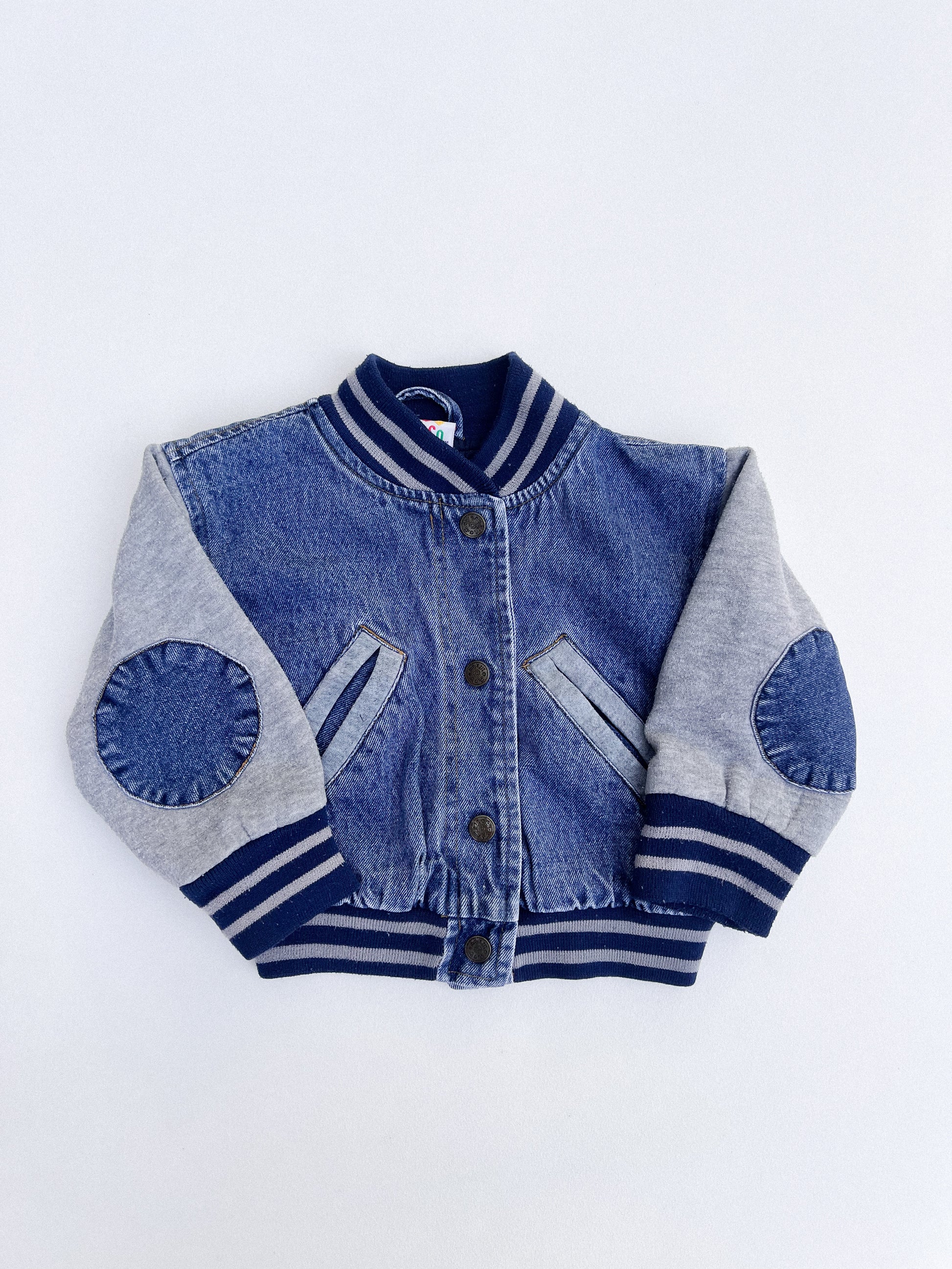 Vintage bomber jacket with grey sleeves and patches.